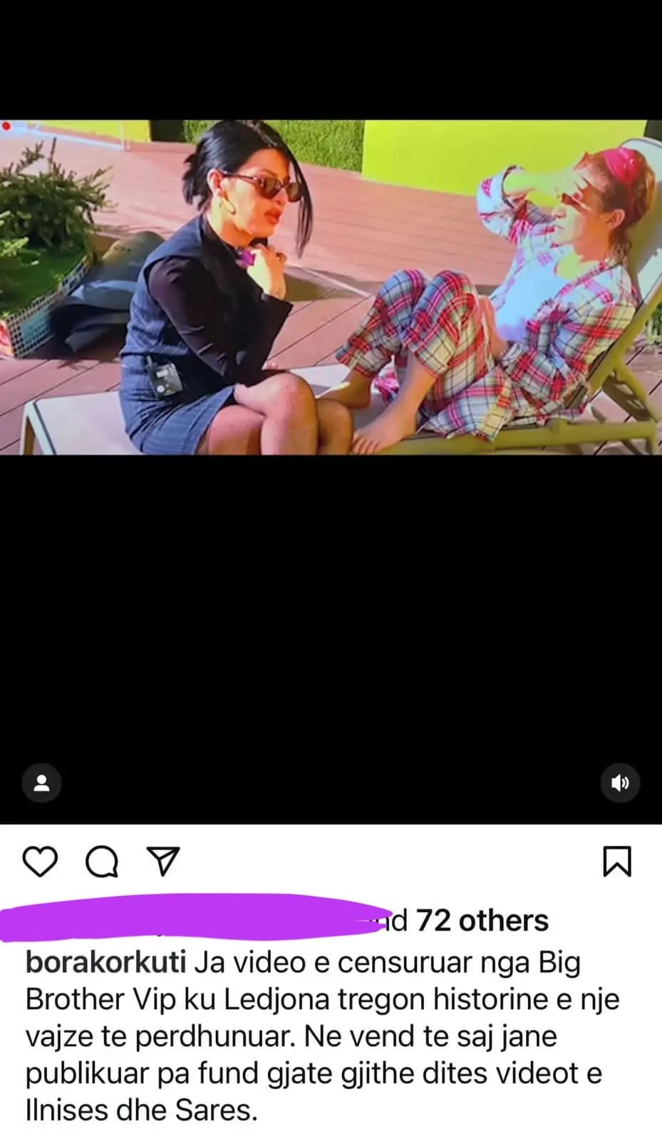 “Ja video e censuruar nga Big Brother Vip ku Ledjona tregon historine e nje vajze te perdhunuar. Ne vend te saj jane publikuar pa fund gjate githe dites videot e Ilnises dhe Sares.” – shkruan ajo.