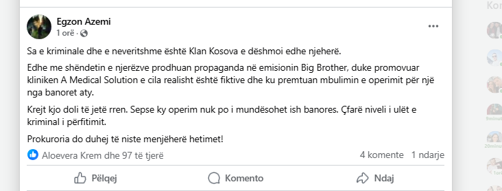Ndërkaq, në komente, Azemi ka thënë se ka rezultuar që klinika operon pa licencë dhe se është njoftuar Inspektorati Shëndetësor për këtë.