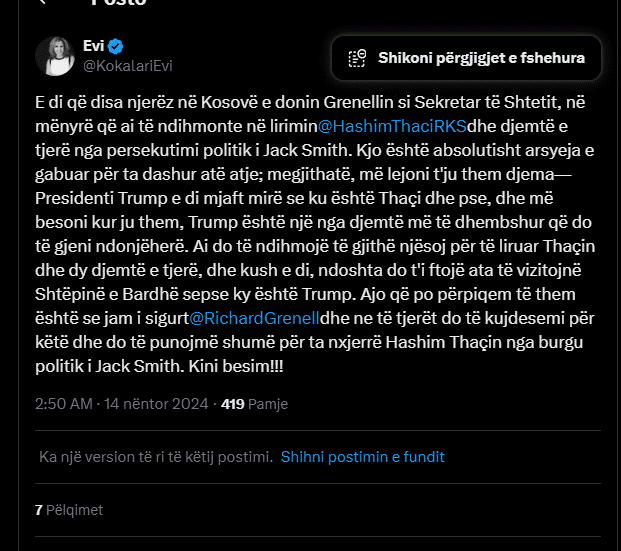 Evi Kokalari, aktiviste shqiptare në ShBA, ka shkruar në lidhje me Gjykatën Speciale dhe gjykimin ndaj Hashim Thaçit, ish-president i Kosovës.