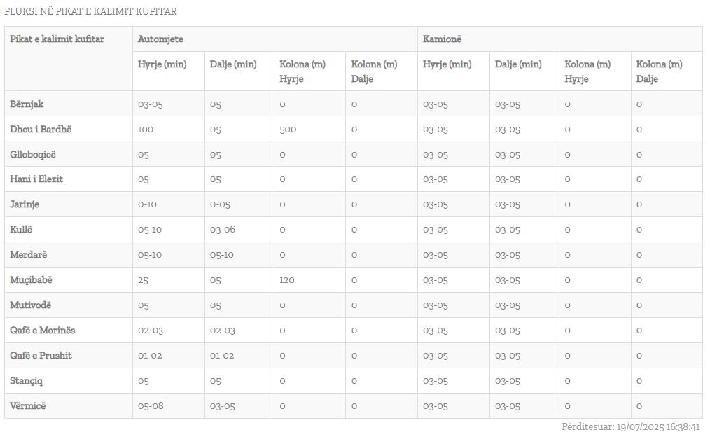 Fluksi i mërgimtarëve që po kthehen në Kosovë për pushime ka krijuar pritje të gjata në pikat kufitare, veçanërisht në Dheun e Bardhë, ku sipas Qendrës Kombëtare për Menaxhim Kufitar, koha e pritjes ka arritur në mbi 1 orë e 40 minuta.