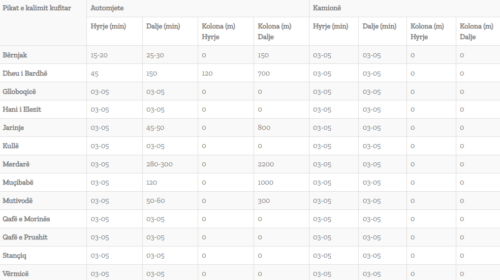 Sipas përditësimit të fundit të Qendrës Kombëtare për Menaxhimin Kufitar, pritjet më të gjata janë regjistruar në vendkalimin kufitar në Merdar, ku për të hyrë në Serbi po pritet deri në pesë orë.