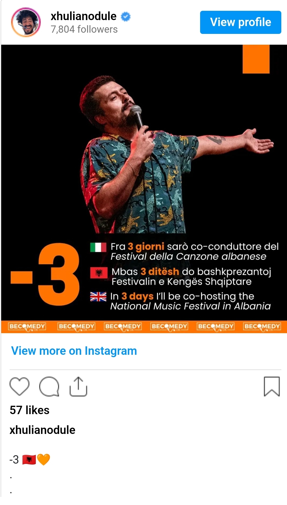 Kujtojmë se Xhuliano u bë mjaft viral së fundmi në Shqipëri dhe në Itali, në rrjetet sociale, falë numrit të tij ku shpjegonte “prejardhjen”, material që e ka bërë më të njohur, ndërsa tashmë do e shohim edhe në një skenë të rëndësishme si ajo e Festivalit, me siguri me shumë batuta.