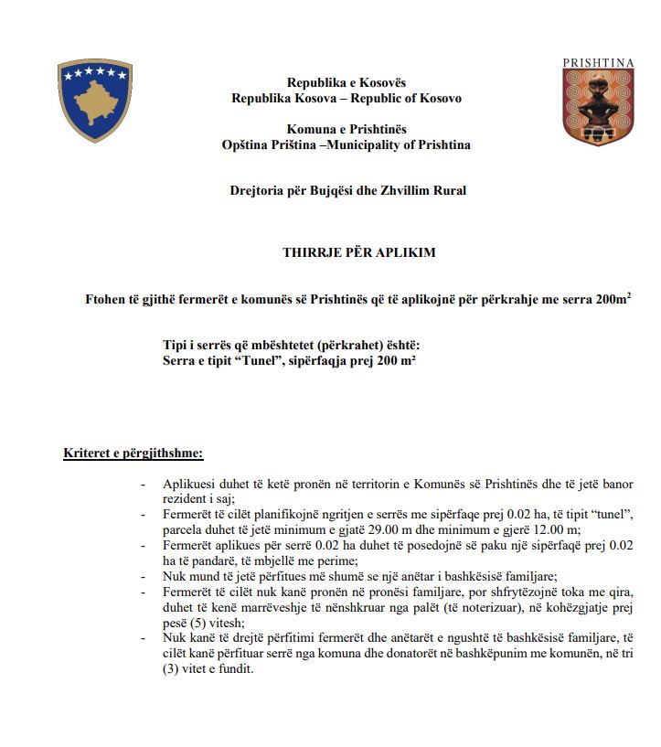 Sipas njoftimit, përfituesit duhet të jenë banorë rezidentë të Komunës së Prishtinës dhe të kenë pronë apo marrëveshje të rregulluar për shfrytëzim toke me qira në kohëzgjatje prej së paku pesë vitesh. Parakusht është që parcela të ketë përmasa minimale dhe të jetë e përshtatshme për ngritjen e serrës së planifikuar, si dhe aplikuesit të mos kenë përfituar më parë serra nga komuna ose donatorët në tre vitet e fundit.