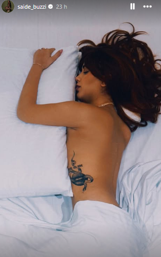 Në imazh bie në sy edhe tatuazhi i saj, i cili merr vëmendje të veçantë dhe plotëson stilin e saj provokues.