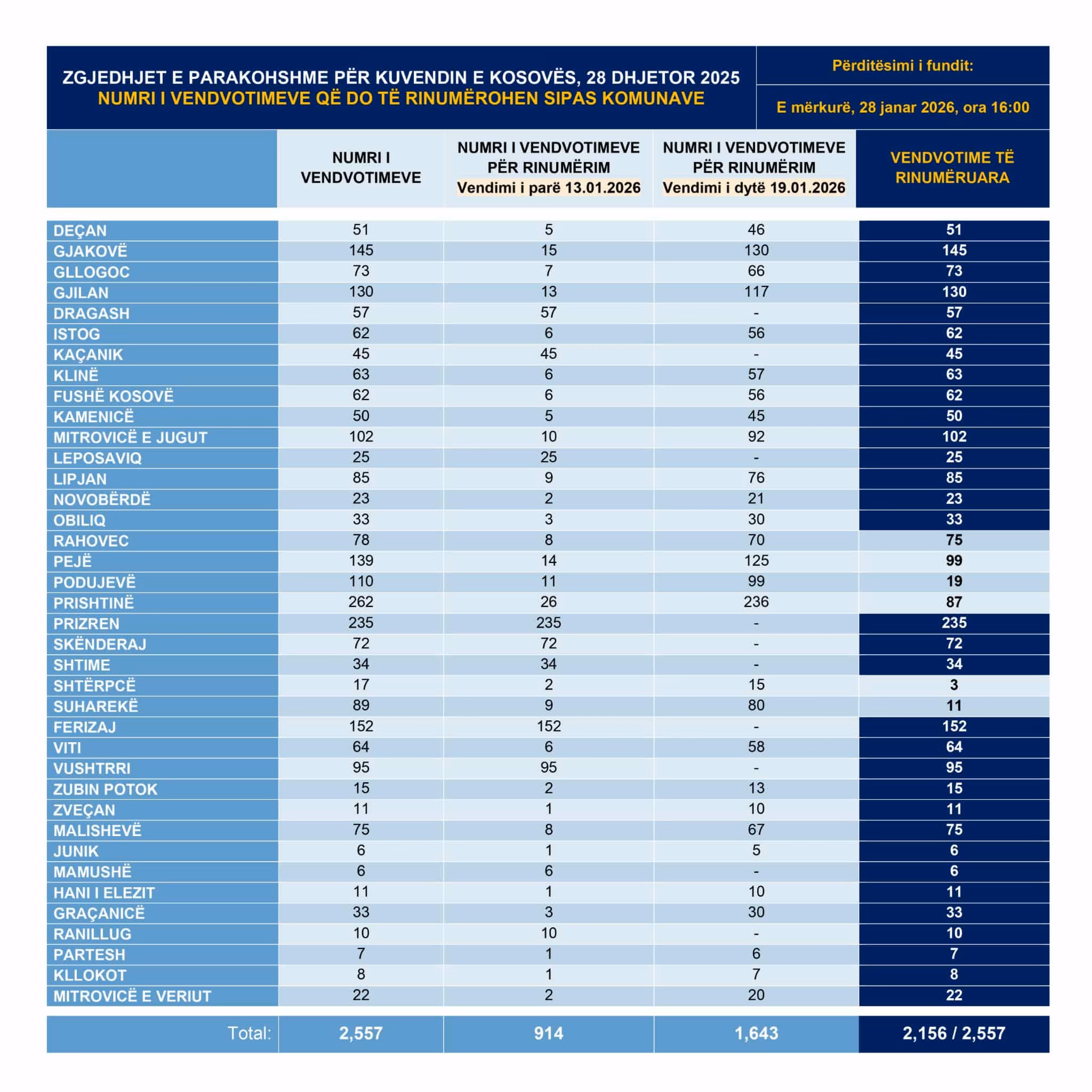 Sipas të dhënave zyrtare të KQZ-së, që nga fillimi i këtij procesi të martën, më 13 janar 2026, në ora 18:00, e deri sot, më 28 janar 2026, në ora 16:00, janë rinumëruar rreth 85 për qind e vendvotimeve, përkatësisht 2,156 nga gjithsej 2,557.