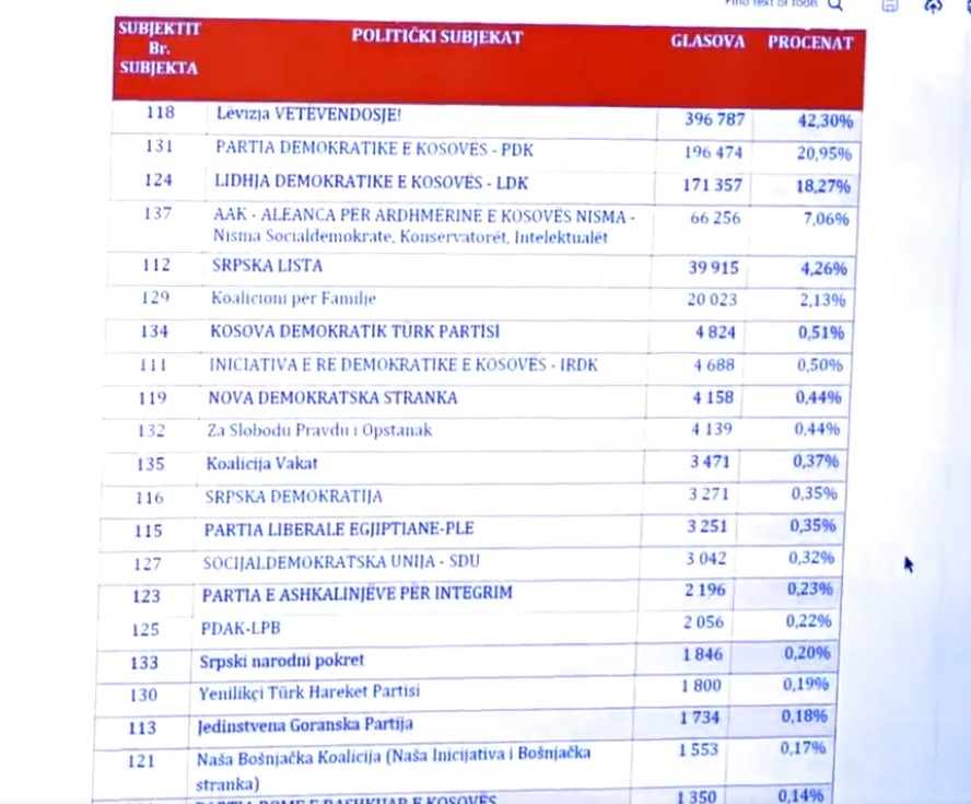 Nga këto zgjedhje, Lëvizja Vetëvendosje ka marrë 396787, (42.30%), PDK-ja mori 196,474 vota (20.95%), LDK-ja mori 171357 (18.27%), ndërkaq koalicioni AAK-NISMA 66256 (7.06%).