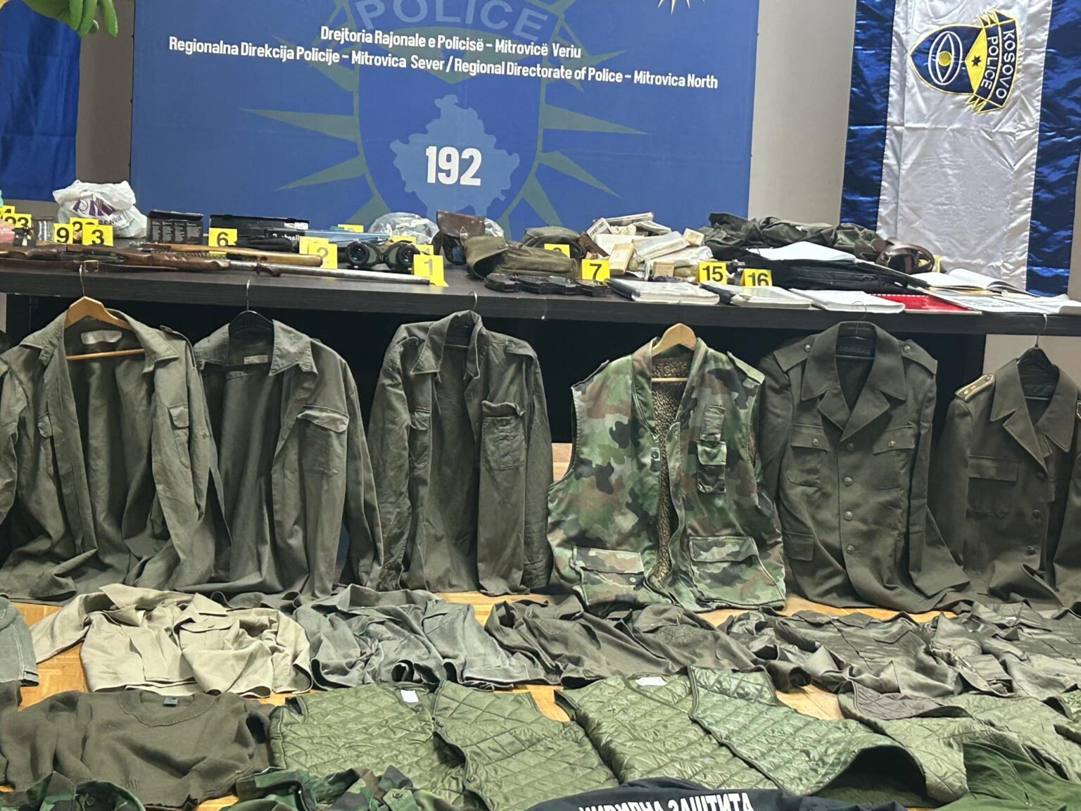 “Pajisje për pastrimin e armës, dy gazmaska, pajisje ushtarake për ushqim, çantë për ndihmë të parë, qese për pajisje dhe ndihmë të parë, dy vula, literaturë të ndryshme, çantë me dokumente, substancë të dyshuar të eksplozivit, telefona, dylbi, dy shigjeta, substancë e dyshuar e eksplozivit, thikë, karikator i zbrazët, disa çanta ushtarake, jakne me mbishkrime si dhe 31-40 uniforma ushtarake të ndryshme, ku në mesin e tyre një është e organizatës ‘Mbrojtja Civile’”, tha Hoxha, njofton Klankosova.tv.