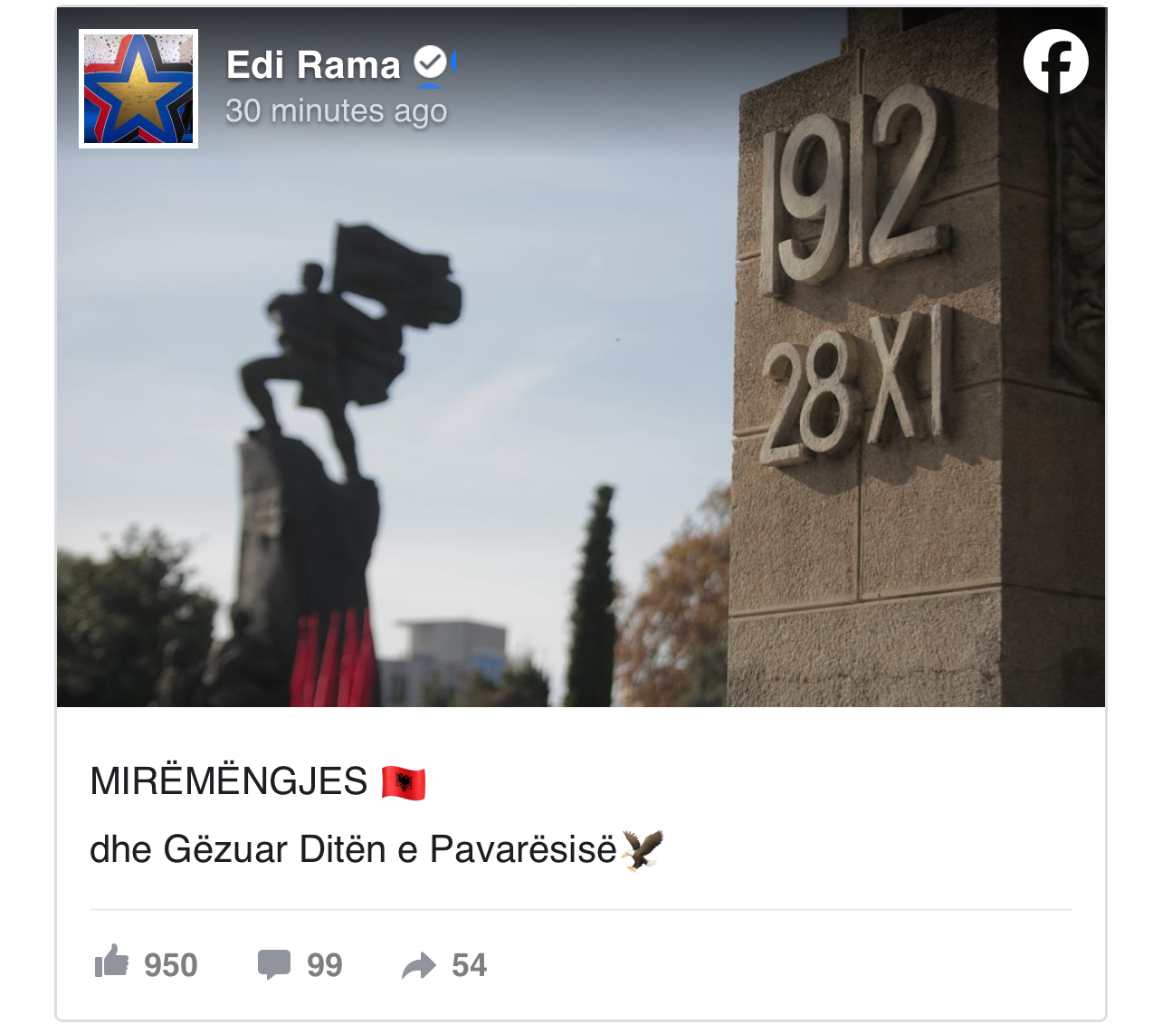 “MIRËMËNGJES dhe Gëzuar Ditën e Pavarësisë”, shkruan kryeministri Rama shkurtimisht në rrjetet sociale.