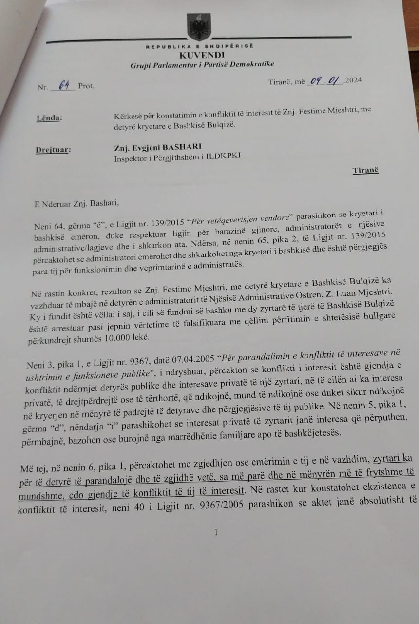 “Nisur nga situata e paligjshmërisë dhe konfliktit të interesit në Bashkinë Bulqizë, i kam kërkuar sot Inspektoriatit të Lartë për Deklarimin e Pasurisë dhe Konfliktit të Interesave që të fillojë urgjentisht një hetim administrativ, të konstatojë situatën e konfliktit të interesit ndërmjet kryebashkiakes në detyrë dhe administratorit të Njësisë Administrative të Ostrenit, motër e vëlla, si dhe të ndërmarrë masat e tjera ndëshkuese në përputhje me ligjin.