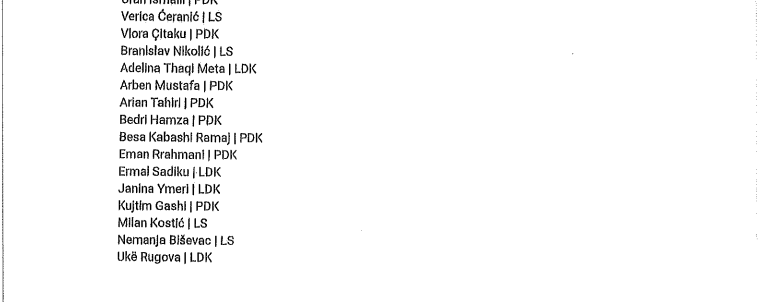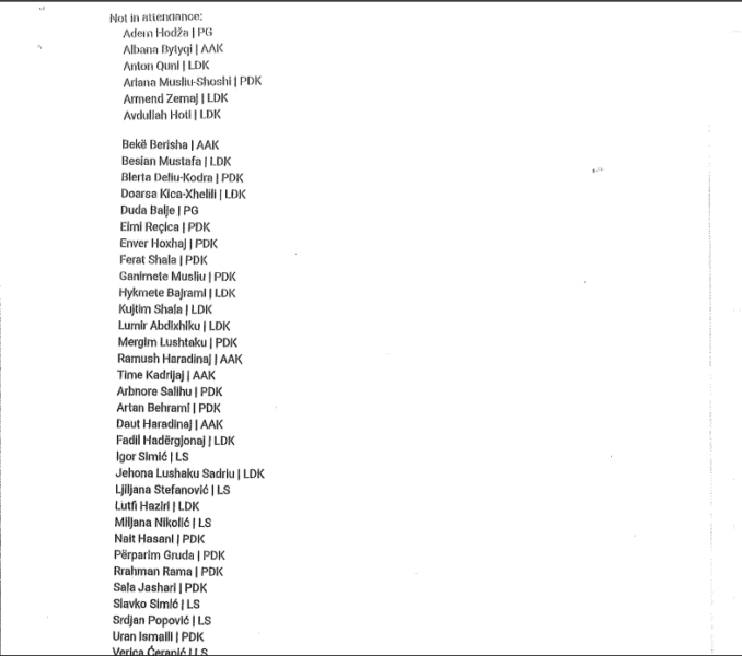 Për këtë, Haxhiu ia ka bashkuar shkresës edhe emrat e deputetëve që s’kanë marrë pjesë në seancë, e ku përfshihen edhe deputetët e Listës Serbe.