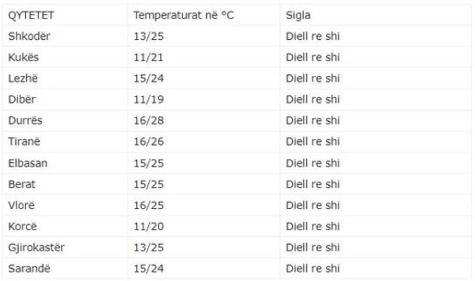 Moti parashikohet të jetë me alternime vranësirash e intervale të herëpasherëshme kthjellimesh. Reshjet e shiut parashikohen të jenë të herëpasherëshme me intensitet të ulët, si dhe shtrëngata të izoluara lokale që prej orëve të para të 24 orëshit fiillimisht në Jug të vendit.
