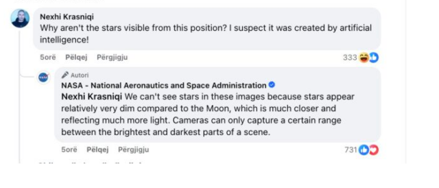 Në faqen zyrtarë të NASA, një shqiptare e Kosovës, e identifikuar në rrjetet sociale si Nexhi Krasniqi, ka hedhur dyshime se pamjet janë të krijuara me inteligjencë artificiale.