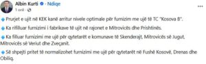 “Prurjet e ujit në KEK kanë arritur nivele optimale për furnizim me ujë të TC “Kosova B”. Ka rifilluar furnizimi i fabrikave të ujit në rajonet e Mitrovicës dhe Prishtinës. Ka filluar furnizimi me ujë për qytetarët e komunave të Skenderajt, Mitrovicës së Jugut, Mitrovicës së Veriut dhe Zveçanit. Së shpejti pritet të normalizohet furnizimi me ujë për qytetarët në Fushë Kosovë, Drenas dhe Obiliq”, ka shkruar Kurti.