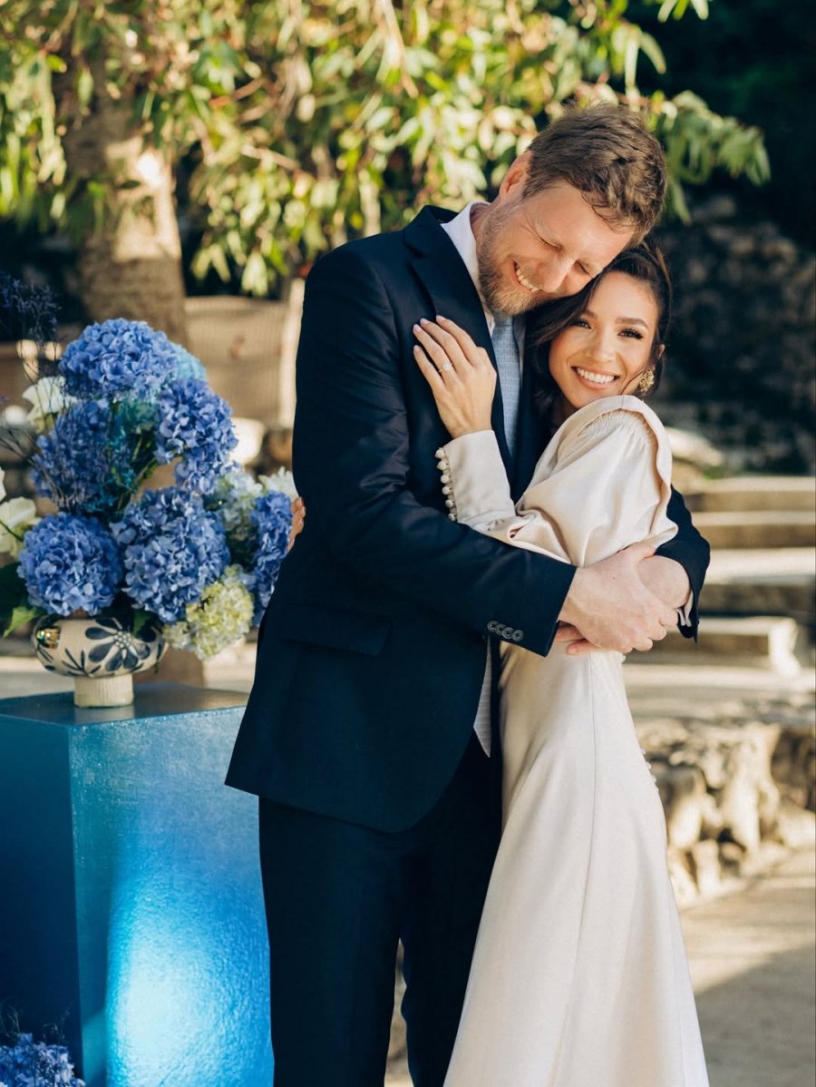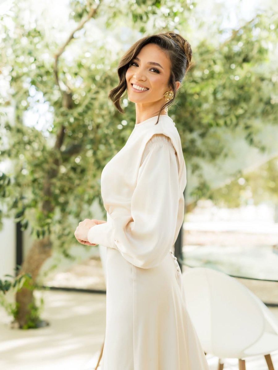 E veshur me një fustan të gjatë saten në ngjyrë fildishi, ajo shkëlqente në një dhomë të mbushur me dritë dhe bimë të gjelbra, ndërsa në një nga fotot tregonte me krenari unazën e saj të re.
