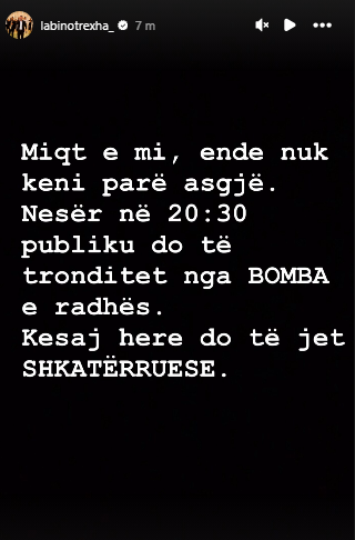 Përmes një postimi në InstaStory, ai ka shkruar: “Miqt e mi, ende nuk keni parë asgjë. Nesër në 20:30 publiku do të tronditet nga BOMBA e radhës. Kësaj here do të jetë SHKATËRRUESE.”