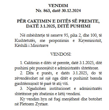Siç ka ndodhur dhe herë të tjera, dita e punës, e datës 3.1.2025, do të zëvendësohet në një nga ditët e pushimit brenda gjashtëmujorit të parë të 2025.