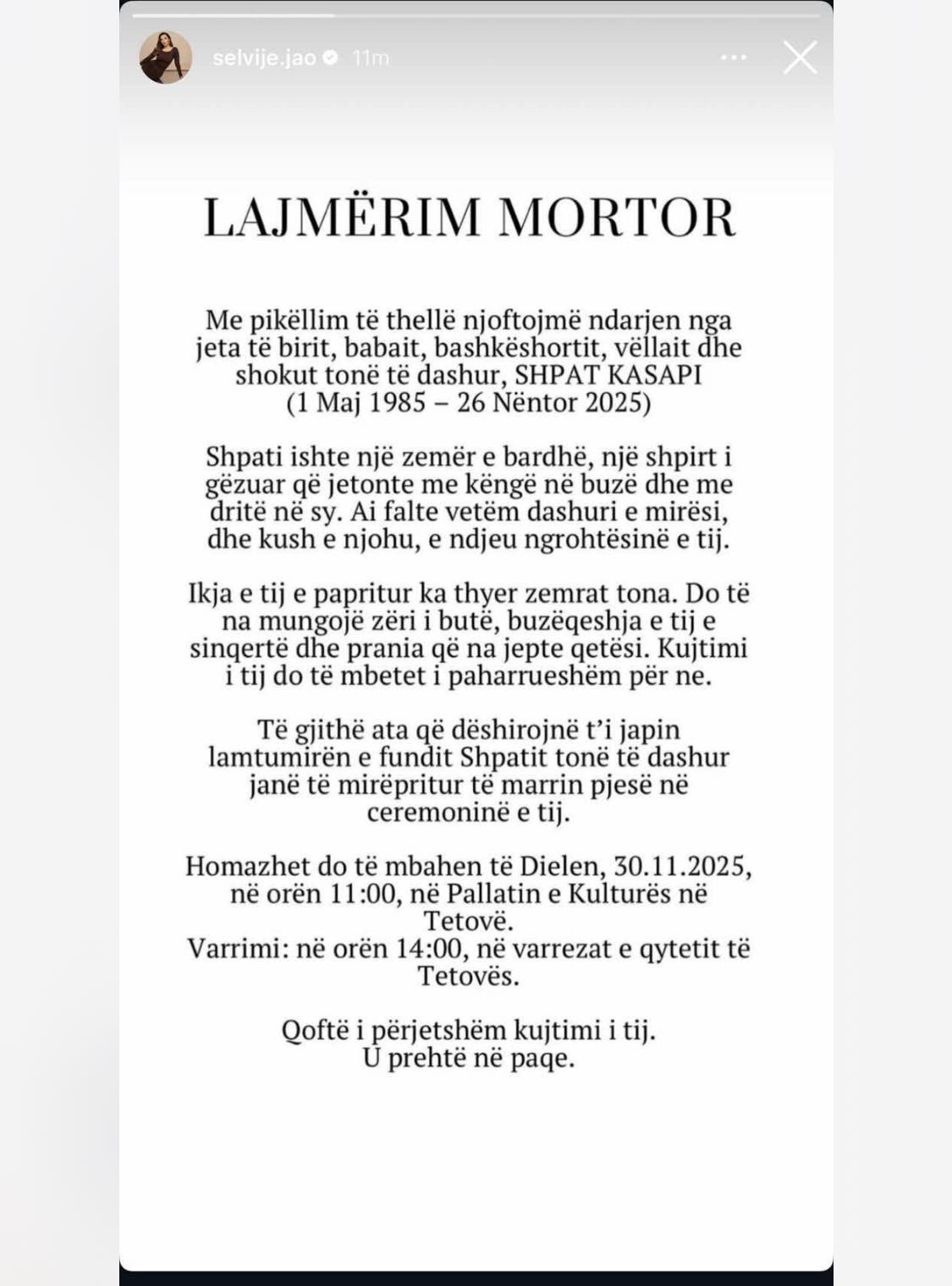 Ajo ka ndarë në Instagram një story ku përcjell të njëjtin informacion për datën dhe orarin e varrimit, duke u drejtuar miqve, familjarëve dhe publikut që kanë shprehur mbështetje këto ditë.