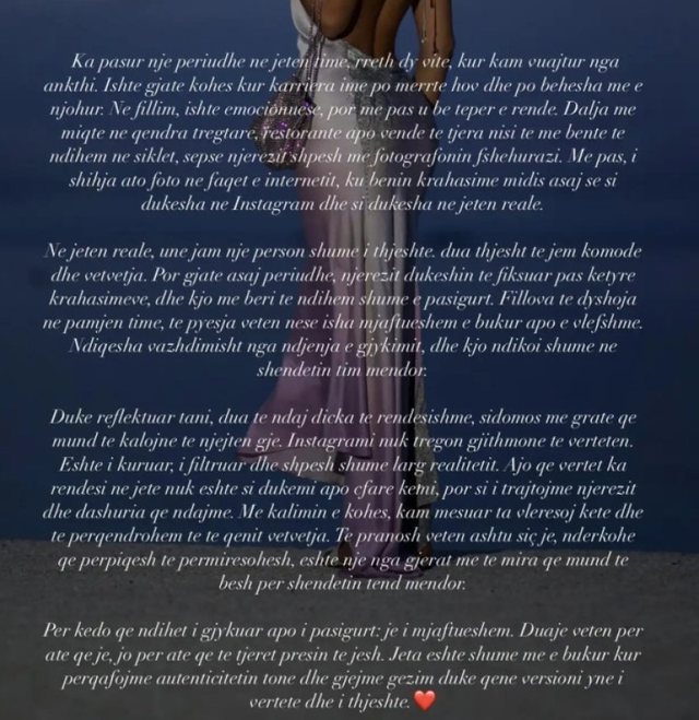 Ajo tha se e krahasonin mes asaj që dukej në Instagram dhe realitetit, gjë që ndikoi në vetëbesimin e saj.“Fillova të pyesja nëse isha mjaftueshëm e bukur apo e vlefshme,” rrëfeu Oriola, duke theksuar se ky presion i imponuar nga standardet e rrjeteve sociale është i rrezikshëm dhe shpesh larg nga realiteti.