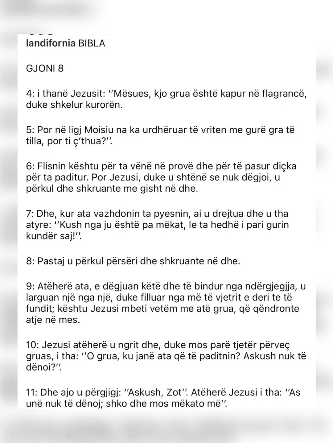 Përmes një postimi në rrjetet sociale, ai ka publikuar një fragment nga Bibla, konkretisht nga Ungjilli sipas Gjonit (8:4–11), pjesa e njohur ku Jezusi shprehet: