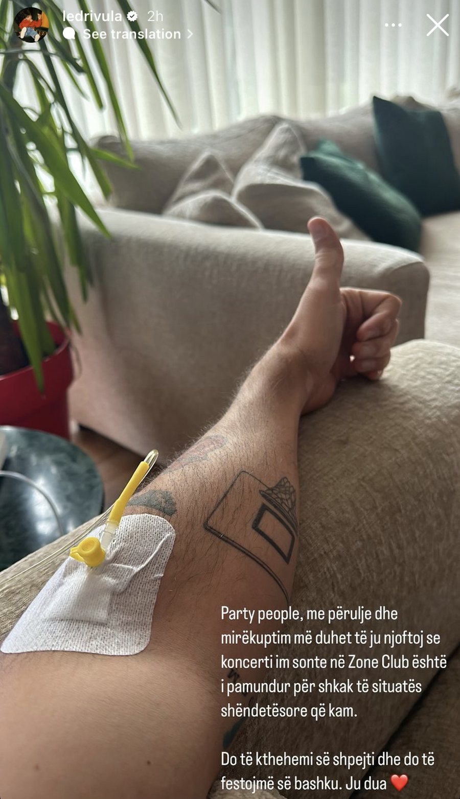 “Njerëz, me përulje dhe mirëkuptim më duhet t’ju njoftoj se koncerti im sonte në Zone Club është i pamundur për shkak të situatës shëndetësore që kam. Do të kthehemi së shpejti dhe do të festojmë bashkë. Ju dua.”