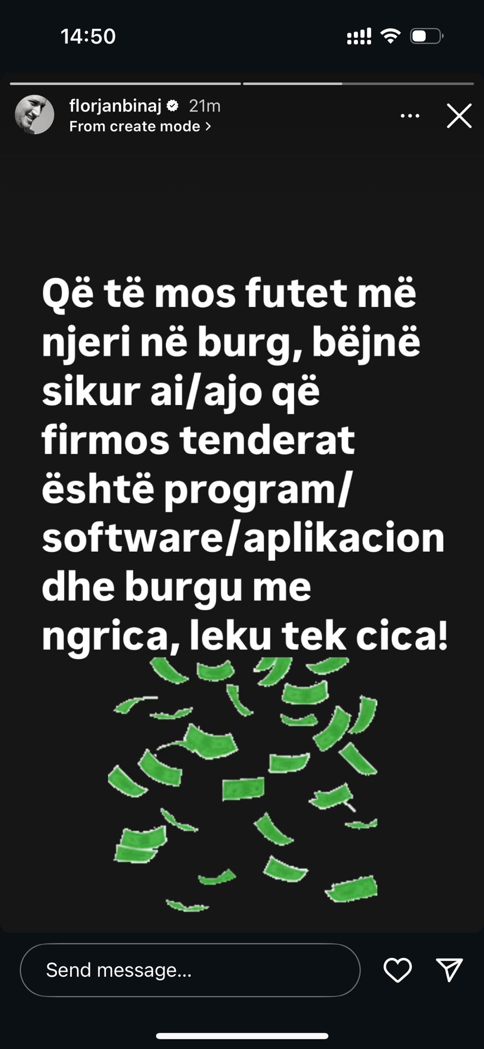 “Që të mos futet më njeri në burg, bëjnë sikur ai/ajo që firmos tenderat është program/software/aplikacion… dhe burgu me ngrica, leku tek c*ca!”, shkroi Binaj, duke e shoqëruar me tone satirike.