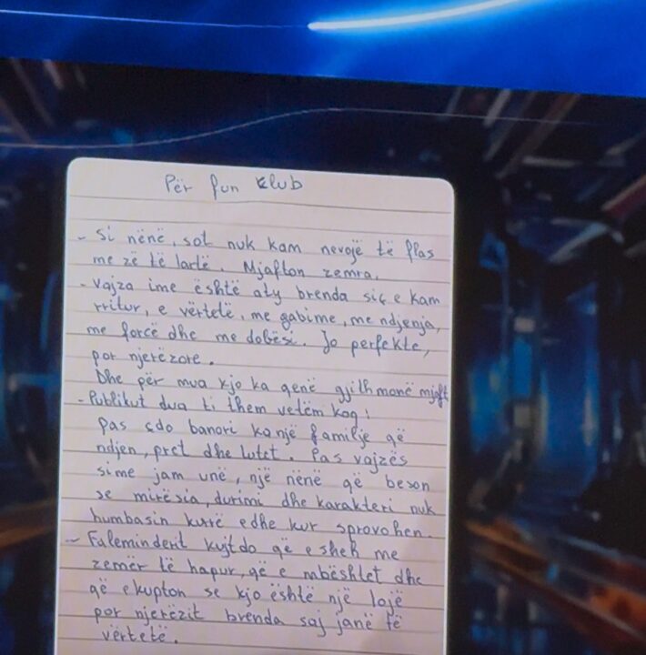 Publikut dua ti them vetëm kaq: pas çdo banori ka një familje që ndjen, pret dhe lutet. Pas vajzës sime jam unë, një nënë që mëson se mirësia, durimi dhe karakteri nuk humbasin kurrë edhe kur sprovohen.
