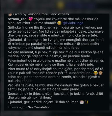 E për këtë ka pranuar urime të shumta, ndër ta është edhe Rozana e cila ka uruar me fjale zemre, shkruan “Kosovarja”.