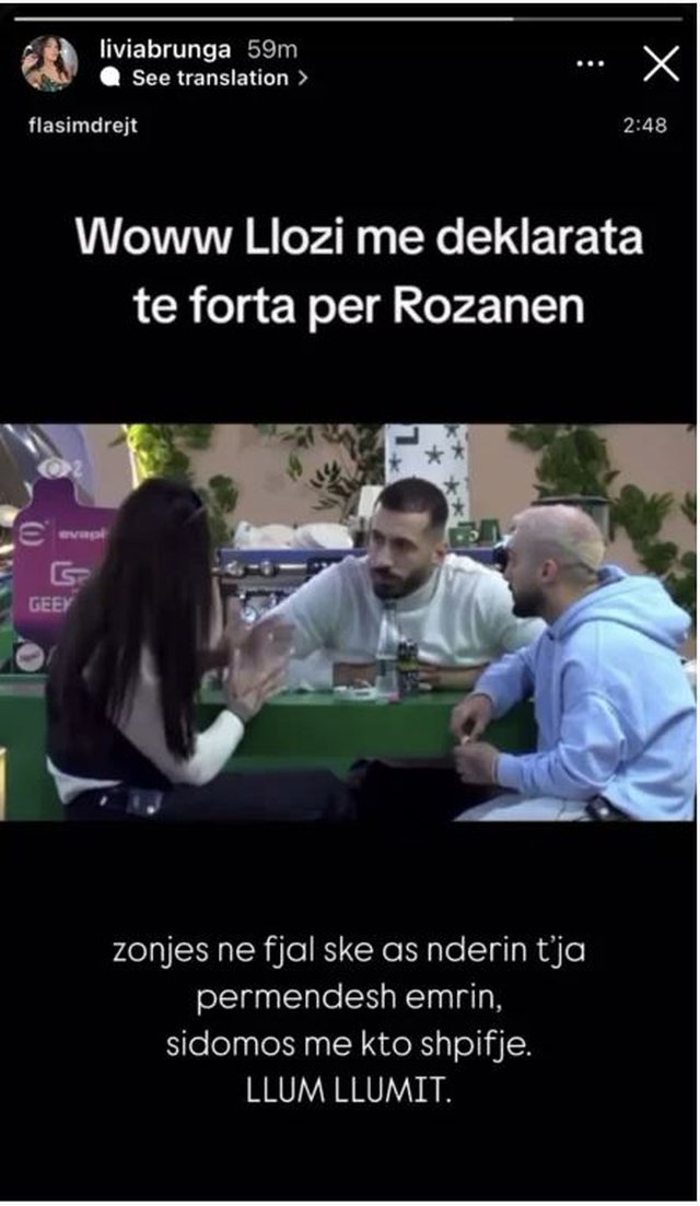 Pas deklaratës së bujshme të Jozit, i cili tha se ka parë Rozana Radin duke vepruar poshtë jorganit me ish-banonen Livia Brunga, kjo e fundit ka reaguar ndaj situatës.