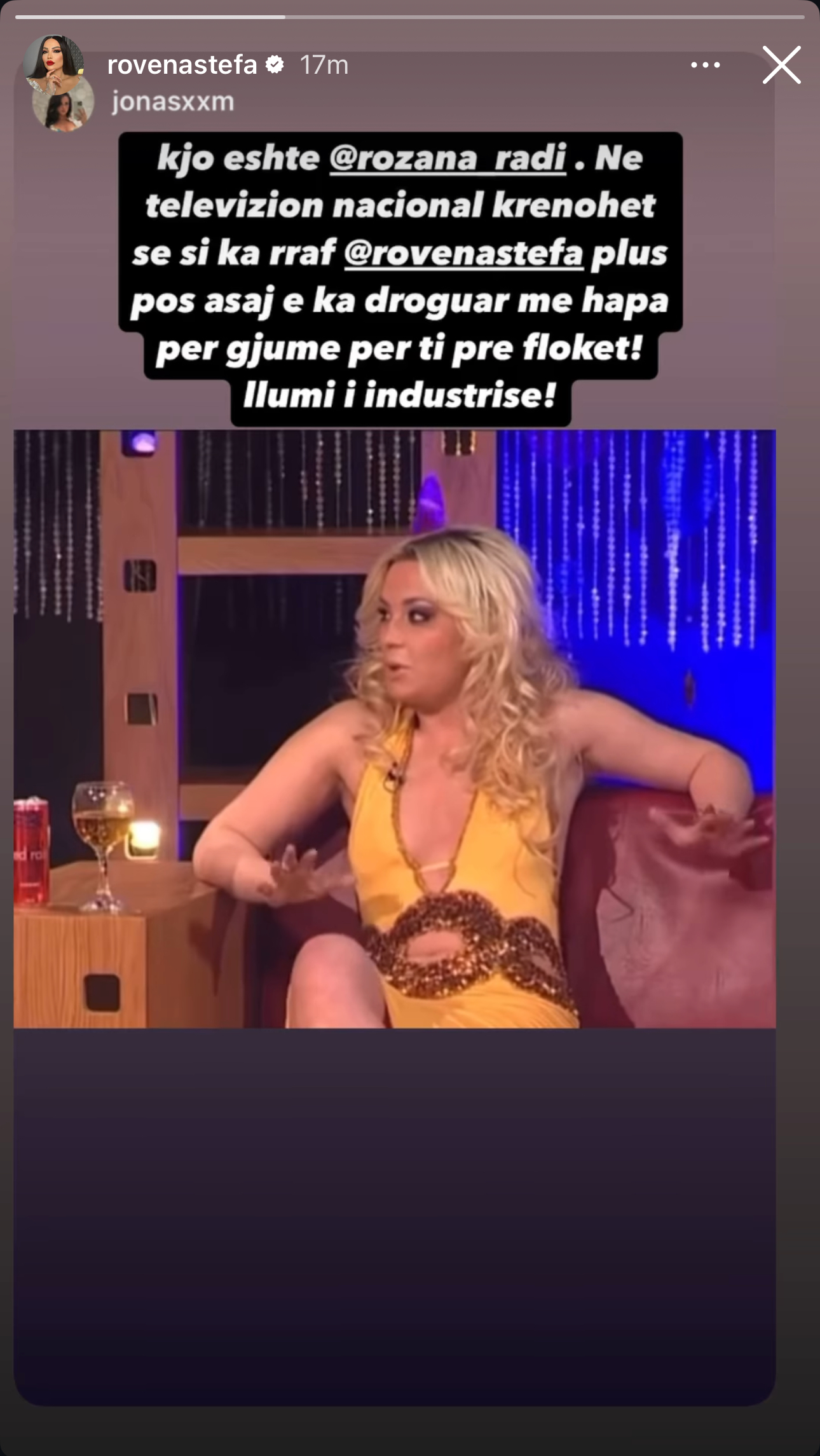 “Kjo është Rozana Radi. Në televizion nacional krenohet sesi ka rraf Rovena Stefën. Plus asaj e ka droguar me hapa gjumi për t’ia prerë flokët. Llumi i industrisë”, thuhet në mbishkrim të videos së ripostuar nga Rovena.