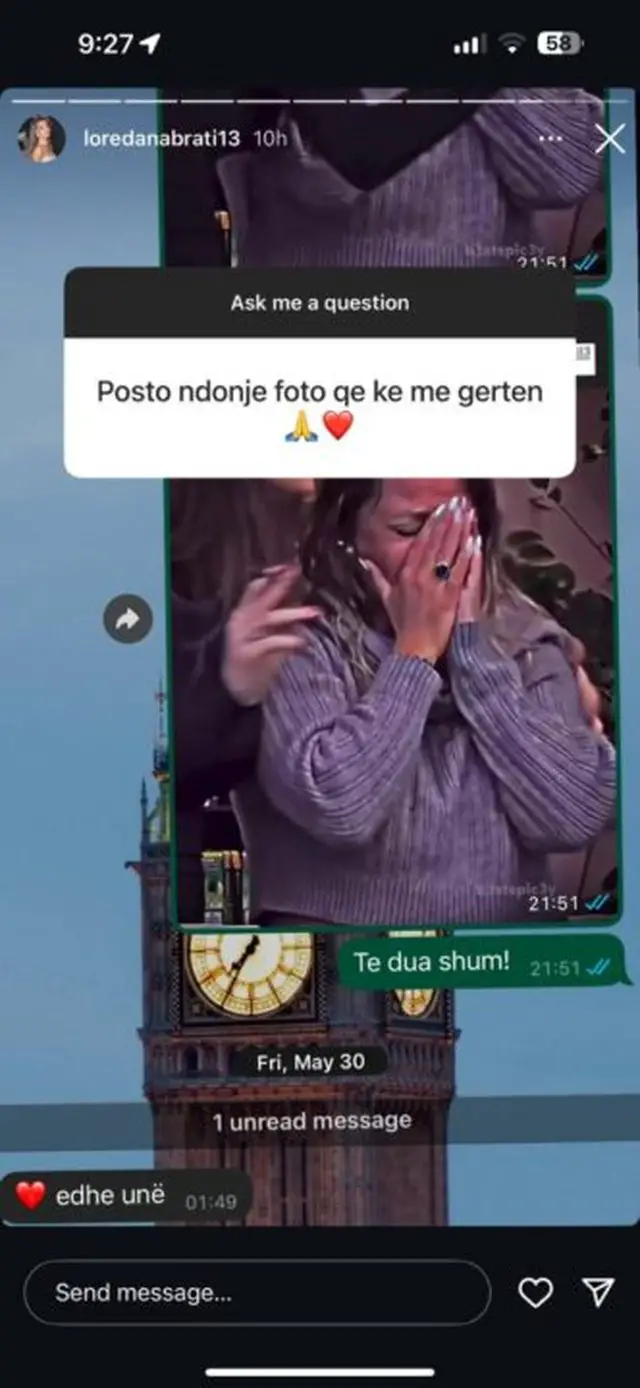 “Të dua shumë”, i ka shkruar Loredana dhe Gixhari i përgjigjet: “Edhe unë”, duke e shoqëruar me një emoji zemër të kuqe.