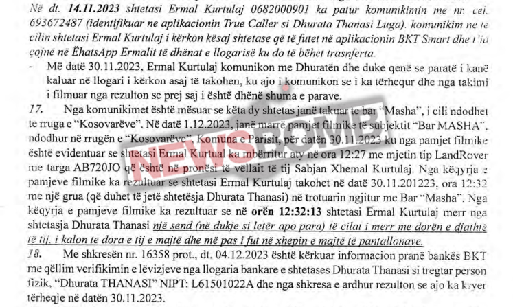 Paratë besohet se janë në vlerë e 259.000 lekëve të reja, ose rreth 2.6 milionë lekë të vjetra pasi Ermal Kurtulaj i ka kërkuar më herët në celular kësaj shtetaseje që t’i priste një faturë fiktive për “Shërbim Kateringu.” Të dy këta shtetas janë takuar në një lokal në Rrugën e Kosovarëve në Tiranë dhe aty kanë shkëmbyer paratë, shkruan newsbomb.al.