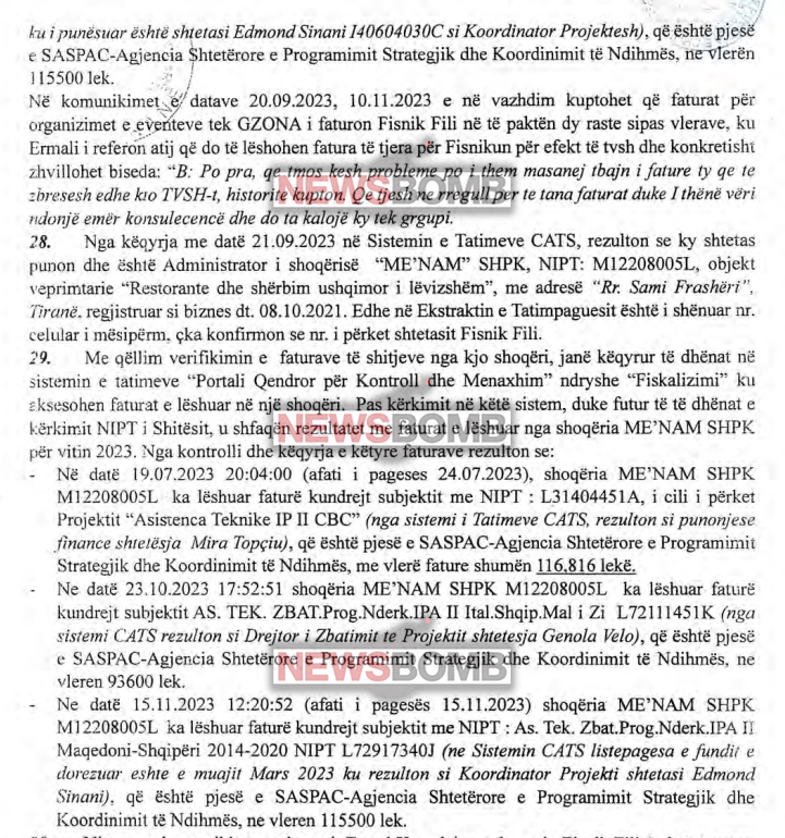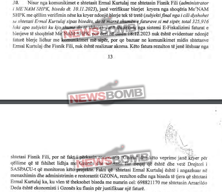 Në dosje përmenden me detaje tre episode kur Fisnik Fili i restorant “ME’NAM” pret fatura me vlerë rreth 3.2 milionë lekë të vjetra në total. Pavarësisht hetimevem, deri më datë 18 Dhjetor 2023 SPAK thotë se Fisnik Fili nuk ka bërë blerje të subjekte të treta që në fund paratë t’i kalonin Ermal Kurtulaj, shkruan newsbomb.al.