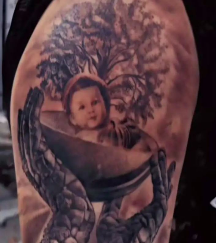 E veçanta e tatuazhit është portreti i vogëlushes, e cila është vendosur brenda një ene të mbajtur nga duar simbolike, me një pemë të fuqishme që simbolizon jetën dhe lidhjen e përjetshme.