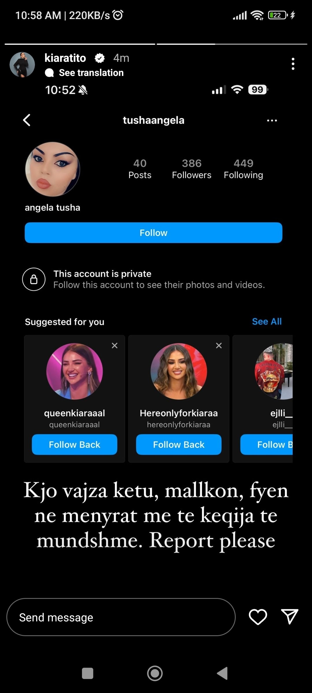 Teksa postoi llogarinë e saj të Instagram-it, Kiara shkroi: “Kjo vajza ketu, mallkon, fyen ne menyrat me te keqija te mundshme. Report please”.
