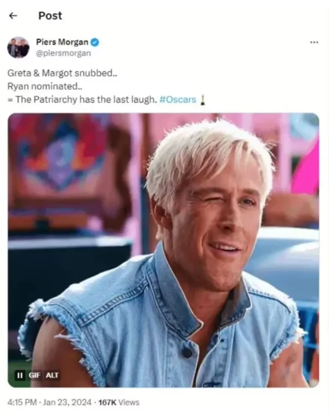 Duke u tallur me gratë (Robbie dhe Gerwig) që nuk arritën të sigurojnë një nominim në Oscars të këtij viti, edhe pse Ryan Gosling u nominua për aktorin më të mirë në rol dytësor, Piers komentoi: “Ata kundërshtuan Gretën dhe Margot. Patriarkia po qesh më në fund”.