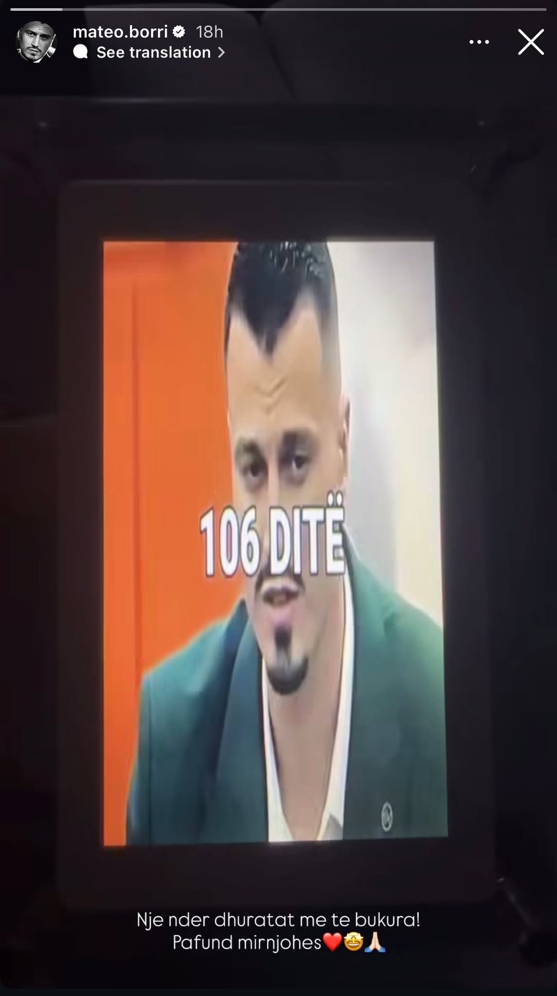 Përmes një postimi në Instagram, Mateo ka përmendur 106 ditët e kaluara brenda shtëpisë, duke i cilësuar si një periudhë të rëndësishme në jetën e tij personale dhe profesionale. Në mesazhin e tij, ai ka shprehur falënderim dhe mirënjohje për mbështetjen që ka marrë gjatë gjithë kësaj kohe, shkruan “Kosovarja”.