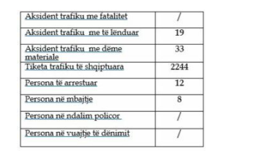Gjatë kësaj periudhe kanë ndodhur 19 aksidente me të lënduar dhe 33 me dëme materiale.