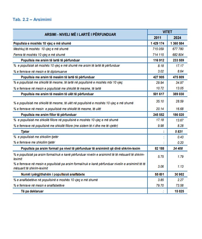 Popullsia me arsim fillor të përfunduar është 186 mijë e 020 banorë. Ndërkaq në vitin 2011 numri i banorëve me arsim fillor të përfunduar ishte 245 552./Indeksonline/
