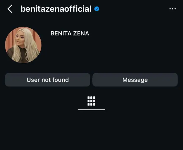 Një situatë e papritur ka shqetësuar ndjekësit e Benita Zenës, ish-banores së Big Brother VIP Kosova, pas zhdukjes së papritur të përmbajtjes së profilit të saj zyrtar në Instagram. Gjatë orëve të fundit, fansat që kanë tentuar të vizitojnë llogarinë e saj janë përballur me mesazhet “User not found” dhe “No posts yet”, duke ngjallur dyshime të forta mbi statusin e faqes së saj.