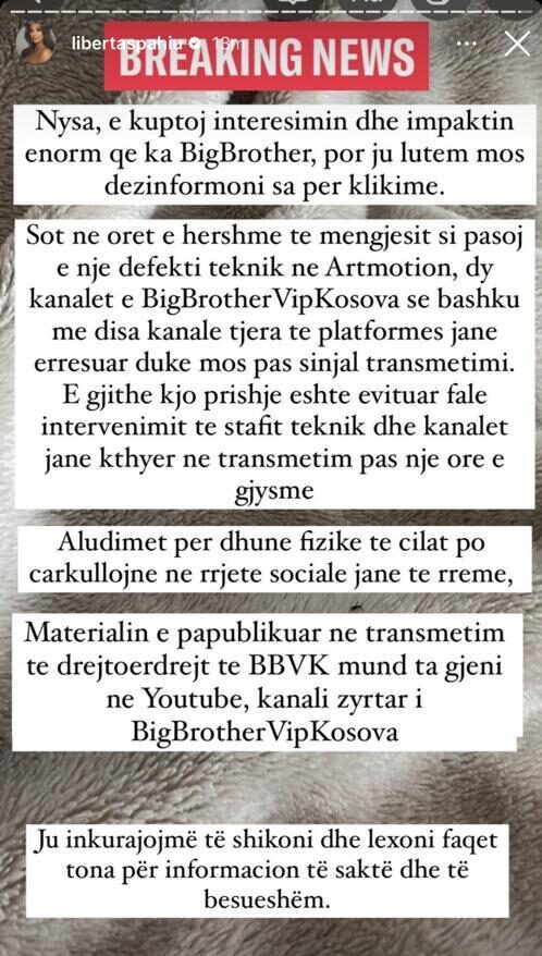Ndjekës të shumtë të formatit kanë qenë ata të cilët kanë aluduar se produksioni po fshihet diçka, por e vërteta është krejtësisht ndryshe. Në një postim në ‘Instastory’, moderatorja Liberta Spahiu hedh poshtë gjithë spekulimet duke thënë se bllokimi i transmetimit ‘live’ është shkaktuar nga një problem teknik dhe se askush nuk është përfshirë në debat apo dhunë.