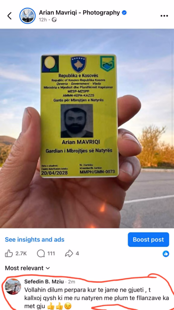 Fotografi i njohur dhe dokumentuesi i jetës së egër, Arian Mavriqi është kërcënuar nga një person në rrjetet sociale.