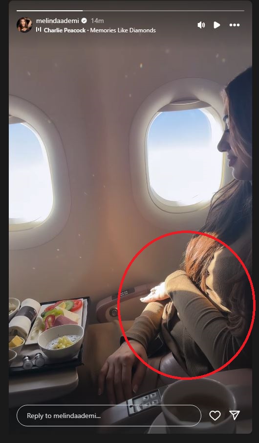 Në Instastory ndau pamje ku shihet brenda në avion. Ajo reklamoi unazën e saj me diamante, por ra në sy barku i saj.