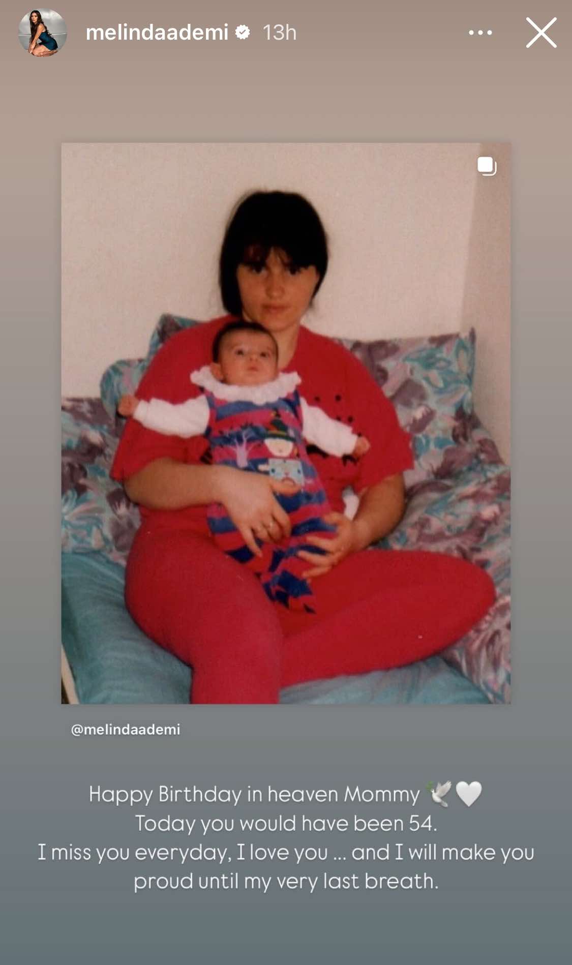 Melinda Ademi pak kohë pas mesnatës ka postuar një dedikim emocional për nënën e saj që tashmë nuk jeton.