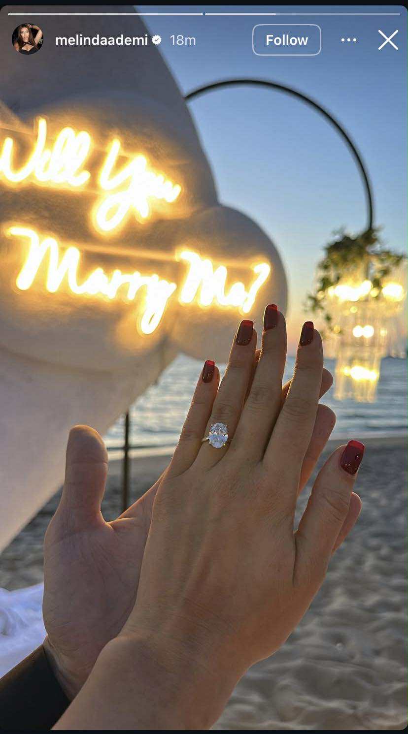 Në një postim emocionues në Instagram, Melinda publikoi foton ku shihet unaza e fejesës, ndërsa në prapaskenë ndriçon mbishkrimi romantik “Will You Marry Me?”.