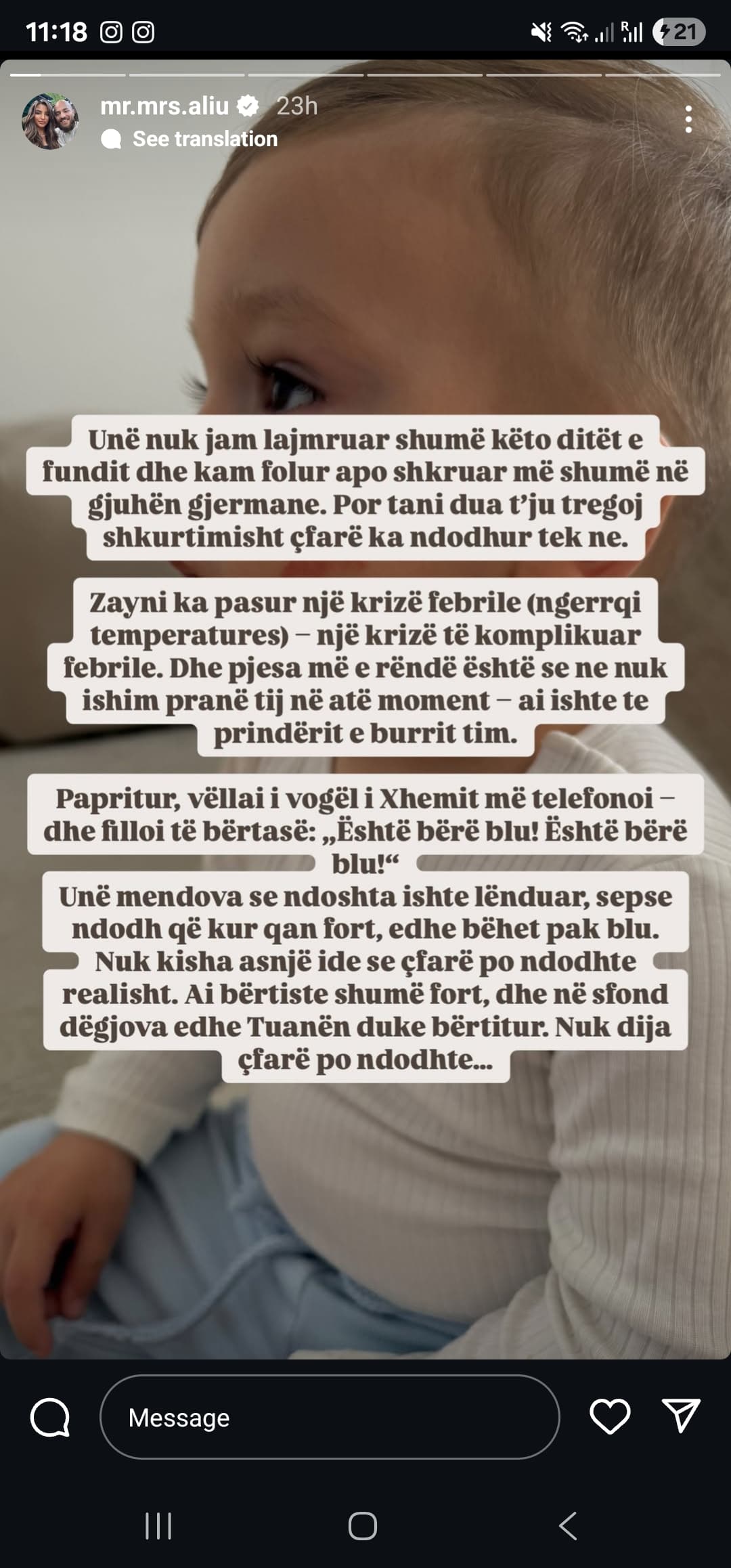 Në një rrëfim të ngjeshur emocionalisht, ajo tregon se si gjithçka ndodhi papritur gjatë një qëndrimi të djalit tek gjyshërit. Fillimisht, një telefonatë alarmuese nga vëllai i vogël i bashkëshortit e njoftoi se fëmija ishte bërë blu në fytyrë. Për Mërgimen, momenti ishte i pakuptueshëm, por shumë shpejt, pas fjalëve të vjehrrit “ka humbur vetëdijen”, ajo kuptoi menjëherë se bëhej fjalë për një krizë febrile – një gjendje që e kishte përjetuar më parë edhe mbesa e saj.