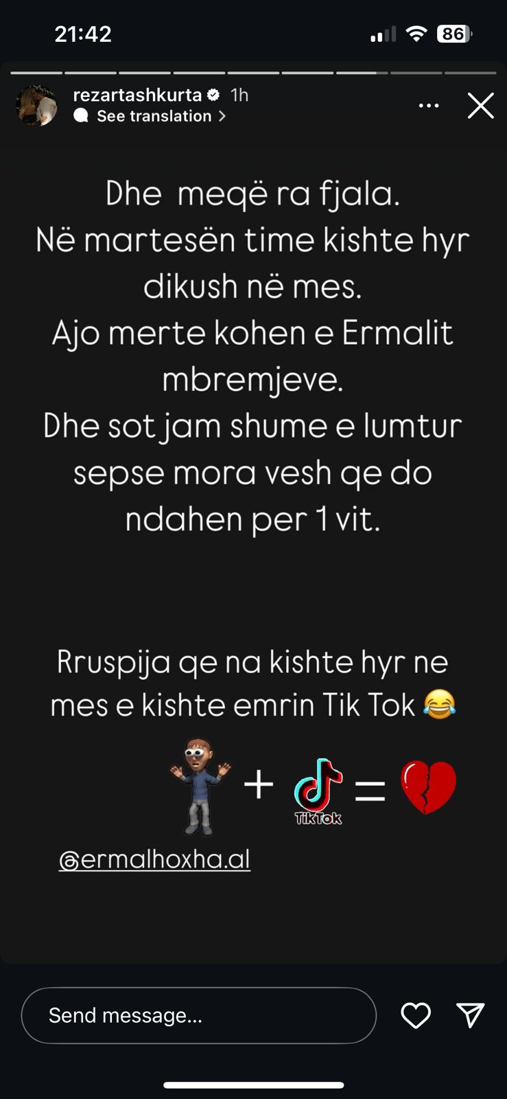 “Dhe meqë ra fjala… Në martesën time kishte hyr dikush në mes. Ajo merrte kohën e Ermalit mbrëmjeve. Dhe sot jam shumë e lumtur sepse mora vesh që do ndahen për 1 vit. Rruspija që na kishte hyrë në mes e kishte emrin TikTok!”, shkruan ajo në postimin e saj.