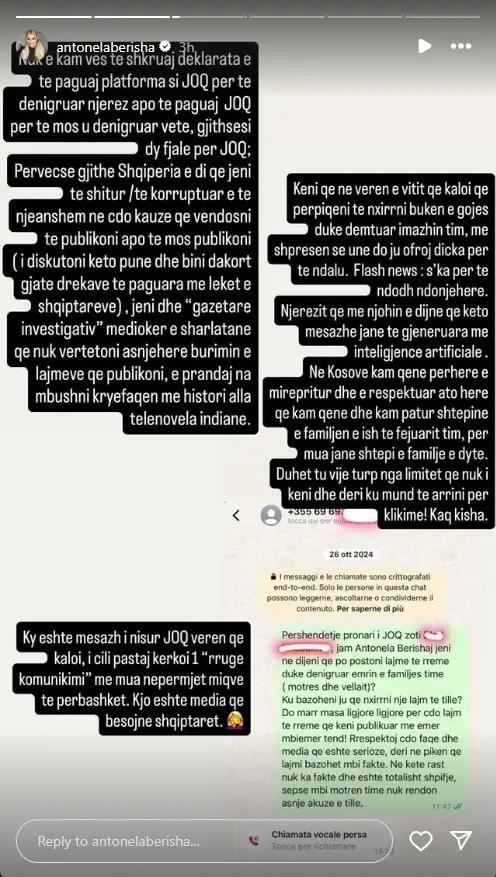 Por reagimi i Antonelës nuk u ndal vetëm tek denoncimi i mesazheve. Në një postim të drejtpërdrejtë në Instagram, ajo akuzoi JOQ për tendencë të vazhdueshme denigruese ndaj saj.