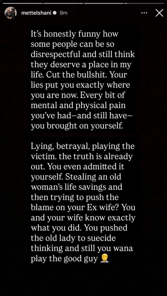 “Është sinqerisht qesharake se si disa njerëz mund të jenë kaq mosrespektues dhe prapë të mendojnë se meritojnë një vend në jetën time. Mjaft me budallallëqe. Gënjeshtrat e tua të vendosën pikërisht aty ku je tani. Çdo dhimbje mendore dhe fizike që ke përjetuar – dhe që ende e përjeton – e ke sjellë vetë mbi vete. Gënjeshtra, tradhti, duke luajtur rolin e viktimës. E vërteta tashmë ka dalë në shesh. Madje e ke pranuar edhe vetë. T’i vjedhësh kursimet e jetës një gruaje të moshuar dhe pastaj të përpiqesh t’ia hedhësh fajin ish-gruas tënde? Ti dhe gruaja jote e dini saktësisht çfarë keni bërë. E shtyve atë grua të moshuar drejt mendimeve për vetëvrasje dhe prapë do të luash rolin e njeriut të mirë”, tha ai.