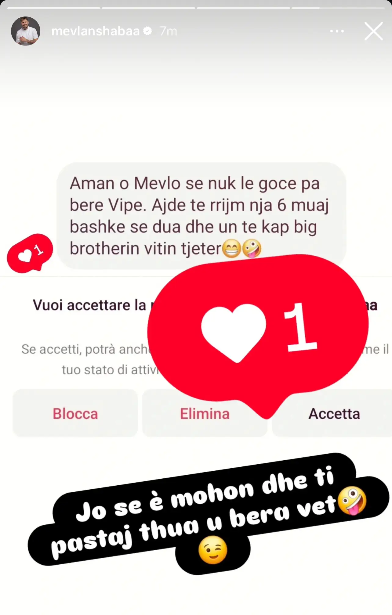“Aman o Mevlo se nuk le goce pa bërë Vipe. Hajde të rrimë nja 6 muaj bashkë se dua dhe unë të kap Big Brother-in vitin tjetër.”
