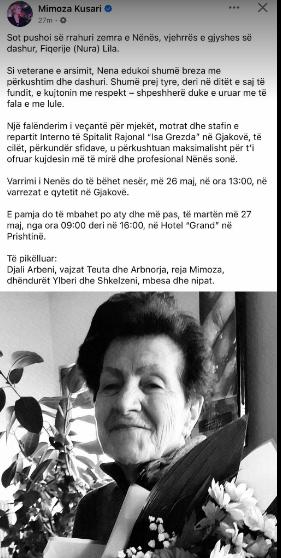 Varrimi i Nenës do të bëhet nesër, më 26 maj, në ora 13:00, në varrezat e qytetit në Gjakovë.